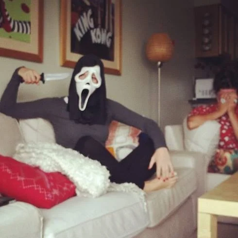 Then I was the Scream killer. I found an iPhone case that turned my phone into a 90s flip phone. I carried around a rubber knife threatened some people. That was fun. But truth be told, I didn't wear my mask very much that night because I needed to access alcohol.